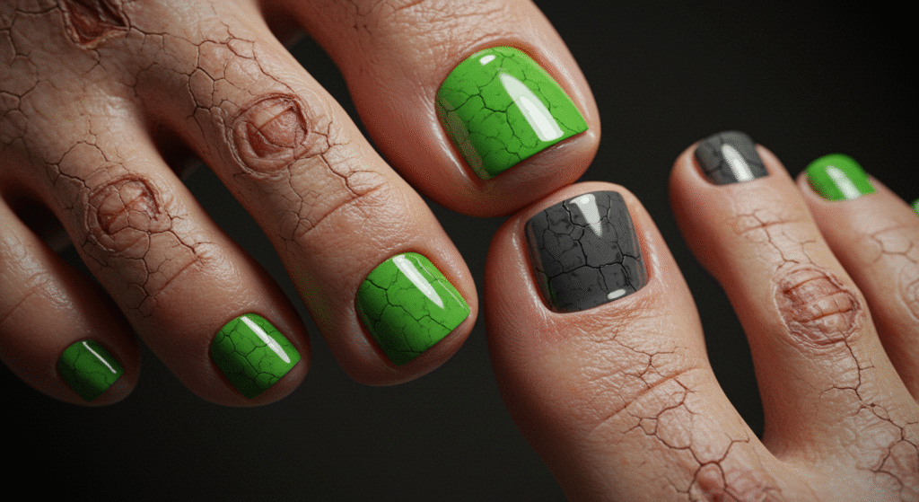This one’s for the brave! Textured nail art mimicking decaying zombie skin, complete with green, grey, and black tones, gives your toes a creepy, horror-movie finish.