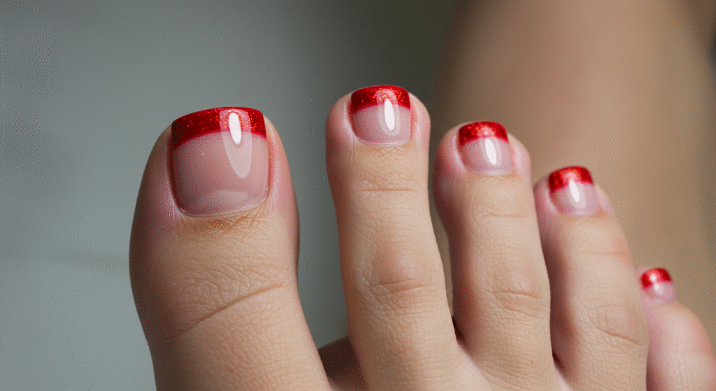 For a touch of sparkle, add silver glitter tips to your red pedicure. This glamorous design is ideal for parties, holidays, or any special occasion where you want to stand out.