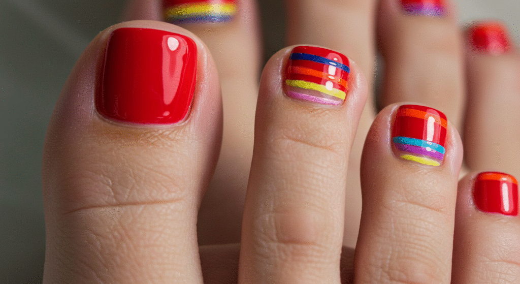 For a playful and vibrant design, create red pedicures with small rainbow stripes. This colorful design adds cheer and joy to your feet, ideal for summer or fun events.
