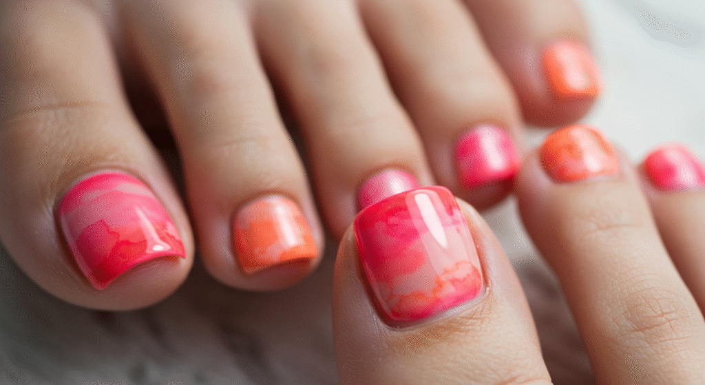For an artistic and fun look, try red nails with bold swirl or wave art. This design adds fluid movement and a contemporary feel to your pedicure.