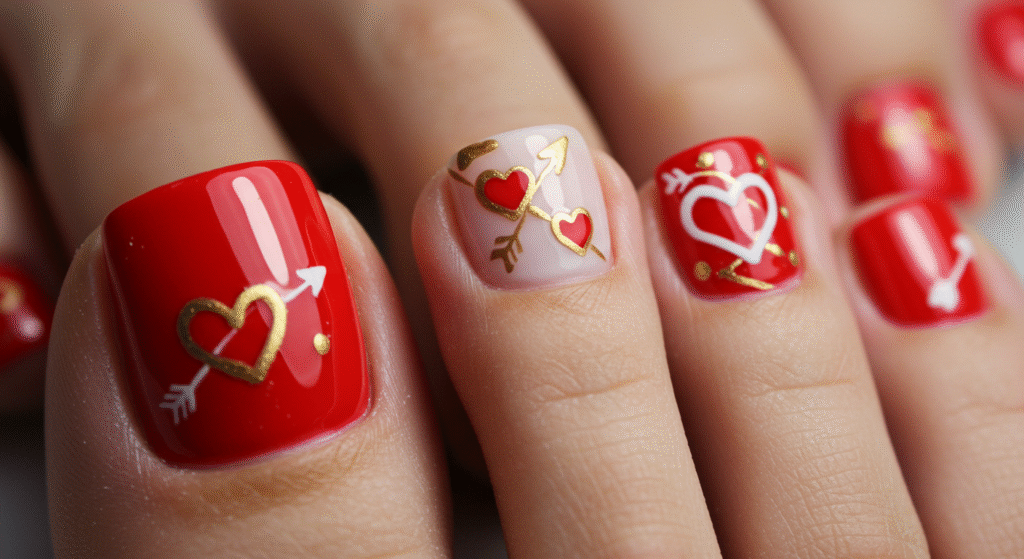For a quirky and fun twist, try adding heart and arrow art to your red pedicure. The hearts can be painted in gold or white, while the arrows add an edgy touch.